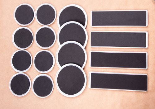-. Feature : 8 small round sliders (3.5" diameter) / 4 medium round sliders (5" diameter) / 4 rectangular sliders (2.5"x9") / Works on floor or carpet / Great for couches, beds, lazy horses, and entertainment units