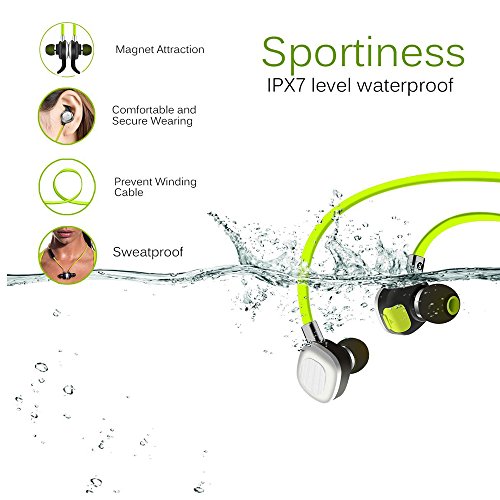 -. Feature : IPX7 WATERPROOF: Say Goodbye to Water-Damage! Protected by advanced plasma Nano Coating your Buds withstand sweaty workouts and will survive accidental dropping into water - Guaranteed! More effective waterproof, than those Bluetooth headphones which are only sweatproof on the market! / MAGNETIC & COMFORTABLE STYLE: Magnetic allows the two ear buds attract with each other, forming a circle on your neck to avoid falling down or losing after exercising. Looks cool as well! The patented winged earphone tips hold your Buds in place during rigorous workouts. Over- and Under-Ear fit options included. / Latest Bluetooth 4.1 & CVC Noise Cancellation 6.0 technology: Easy and fast pairing with smartphones, tablets and other Bluetooth enabled music devices; Reduces outside noises, enable clearer sound from microphone, you get high quality, hands-free phone conversation even on the street or inside shopping mall. / SUPERIOR SOUND: 8mm Speakers combined with Advanced APTX tech, our in-ear design offers incredible sound quality with deep bass and crystal clear treble, no matter your taste in music. Works great for soundtracks, audio books, relaxing sounds, and even techno music. / LONG LASTING BATTERY: With our Bluetooth headset, running & workouts can go for longer to the beat! The polymer 120mAh battery in the Bluetooth headphones wireless device provides 8 hours of talk & playing time & 200 hours of standby time. Much more than other sports headphones!