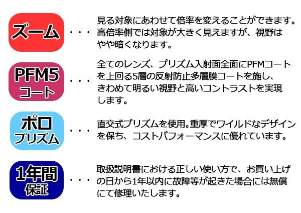 | 仕様 | ●倍率:8~24倍 ●対物レンズ有効径:25mm ●プリズム材質:Bak4 ●実視界:4.5~2.3度 ●見掛視界:36.0~55.2度(34.9~51.4度※) ※JIS B7157:2003に準拠して計算しています。 ●1000m先視界:79~40m ●ひとみ径:3.1~1.0mm ●明るさ:9.6~1.0 ●アイレリーフ:9~12mm ●至近距離:約4m ●眼幅:約58~70mm |