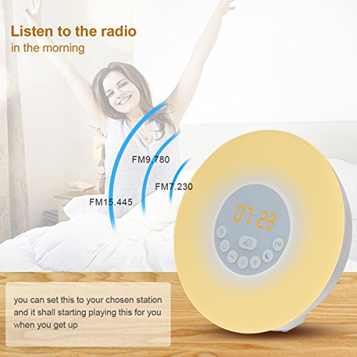 Studio : TEKITSFUN Publisher : TEKITSFUN Binding : Electronics Product Description Features: 1: 7 Colors 10 Brightness Levels: There are 7 colors that you can choose, warm white, green, red, blue, purple, orange, indigo, you can choose the color and brightness levels by yourself, and enjoy the night light. 2: 3 Charging Methods -- Power this useful gadget with a USB charger(Only power this device) or a wall jack, there is an option to use back up 3x AAA batteries (AAA batteries Not included).There?is?no?light?function?when?using?batteries?for?power.We suggest using the batteries and the USB cord together in case of resetting the time when the cord gets disconnected. 3: Sunrise alarm clock will start to brighten up like a sun rise before 30 minutes of your alarm time and wake you up gently. In addition to that, you can help yourself fall asleep with the sunset simulation that will naturally make you drowsy and help you drift off peacefully. 4: Large digital time display in 12/24 H mode 5: An easily find snooze button 6: Easy to set up with touch control 7: Well packaged, perfect gift for your kids and your family.