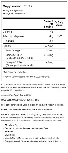 Nature Made Fish Oil Adult Gummies (57 mg of Omega-3s EPA & DHA per serving) 90 Ct .Interactions:Given that no two people are alike, if you are taking any medications you should be aware that potential drug-nutrient interactions may occur and are encouraged to consult a health care professional before using this product. Combining certain prescription drugs and dietary supplements can lead to undesirable effects such as: Diminished drug effectiveness ,Reduced supplement effectiveness, Impaired drug and/or supplement absorptionFeature