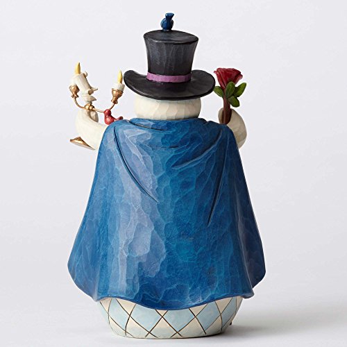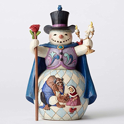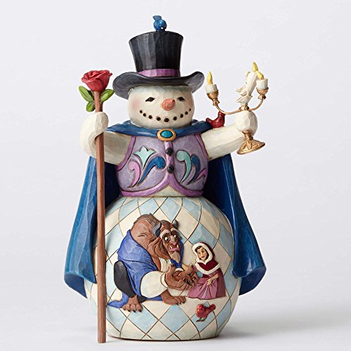 . Enchanted Christmas. Beauty and the Beast Snowman Figurine. Part of the Disney Traditions collection by Jim Shore. Made from stone resin. Approximately 8.3 inches tall (21cm). Includes original manufacturers box and packaging. Made by Enesco. Officially licensed by DisneyFeature