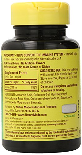 -. Binding : Health and Beauty -. Brand : Nature Made -. Department : Diet & Nutrition -. EAN : 0885675229303 -. Feature : Recommended as part of daily regimen for winter wellness and immunity / Aids in proper function of immune system / Offers antioxidant benefits for lungs and lens of the eye / 1 bottle, contains 130 tablets / null -. IsAdultProduct : 0 -. Label : Nature Made -. Manufacturer : Nature Made -. Model : 1259A -. MPN : 1259A -. NumberOfItems : 1 -. PackageQuantity : 1 -. PartNumber : 1259A -. ProductGroup : Health and Beauty -. ProductTypeName : HEALTH_PERSONAL_CARE -. Publisher : Nature Made -. Size : 130 -. Studio : Nature Made -. Title : Nature Made Vitamin C 500mg with Rose Hips, (130 Tablets) -. UPC : 031604112592