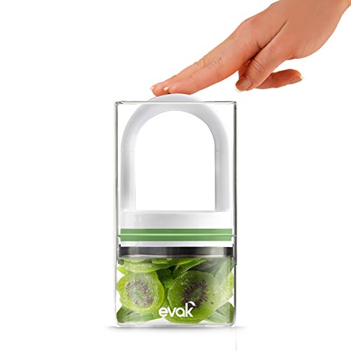 Air takes out the freshness, EVAK takes out the air! The longer your food is exposed to air, the faster it loses flavor. Glass containers with air-tight lids are readily available, but they trap stale air in with your precious food. Evacuate the air and keep your food fresher and longer with EVAK glass storage containers by Prepara. The twin valve system automatically forces the air out as you push down the lid, and allows you to easily pull up and remove the lid to access contents. It's so simple- just push down, then pull up; no buttons or levers. Perfect for coffee, tea, cereal, dried fruits, granola, herbs, spices, confections, etc. There are other food storage containers that remove the air but are made from plastic that comes in contact with your food. With EVAK, only glass and stainless steel contact your food: no harsh plastics. EVAK Is made from the highest quality borosilicate glass and stainless steel, and they are the only parts that come in contact with your food. The handle is made from super- strong ABS plastic with LFGB European grade silicone gaskets on the inside. EVAK Was launched on Kickstarter and is the winner of the 2014 Red Dot Award for Product Design, the 2014 IHA Innovation Award (International Housewares Association) and a 2014 Idea Award Finalist (sponsored by Industrial Designers Society of America). To use, simply fill glass base with dry goods for storage and press handle down to the level of food, air is automatically removed through the valves. To remove, pull handle up. Simple care: base is dishwasher safe, twist off stainless steel cap and hand wash handle.