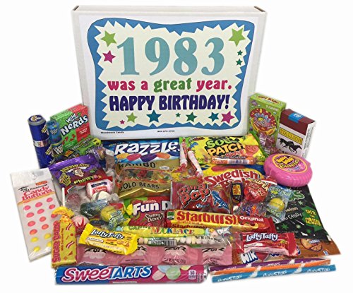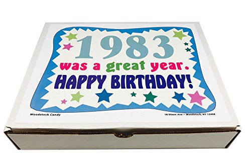 -. Binding : Misc. -. Brand : Woodstock Candy -. Feature : Makes a fun and unique 34th birthday gift for someone born in 1983 / Perfect for the person who has everything / Everyone loves candy from their childhood / Box reads "1983 was a great year. Happy Birthday!" / Comes shrink wrapped in a box that measures 11.75" x 9" x 2" -. IsAdultProduct : 0 -. Label : Woodstock Candy -. Manufacturer : Woodstock Candy -. PackageQuantity : 1 -. ProductGroup : Grocery -. ProductTypeName : GROCERY -. Publisher : Woodstock Candy -. Studio : Woodstock Candy -. Title : 1983 34th Birthday Gift Box of Retro Nostalgic Candy from Childhood for 34 Year Old Men and Women