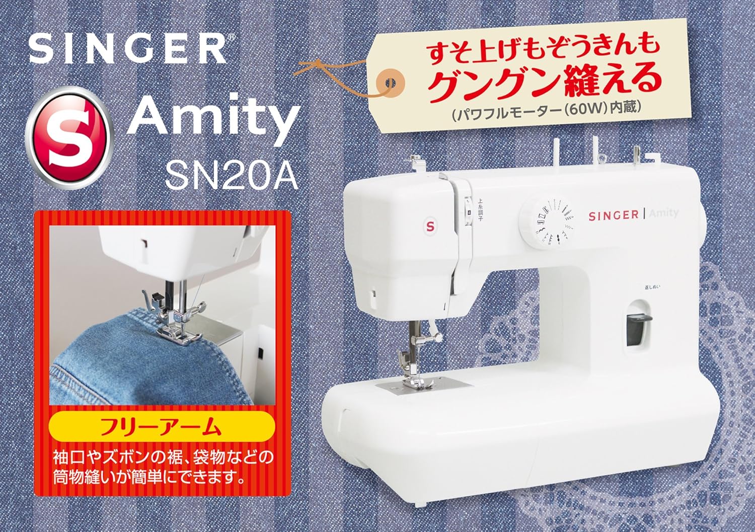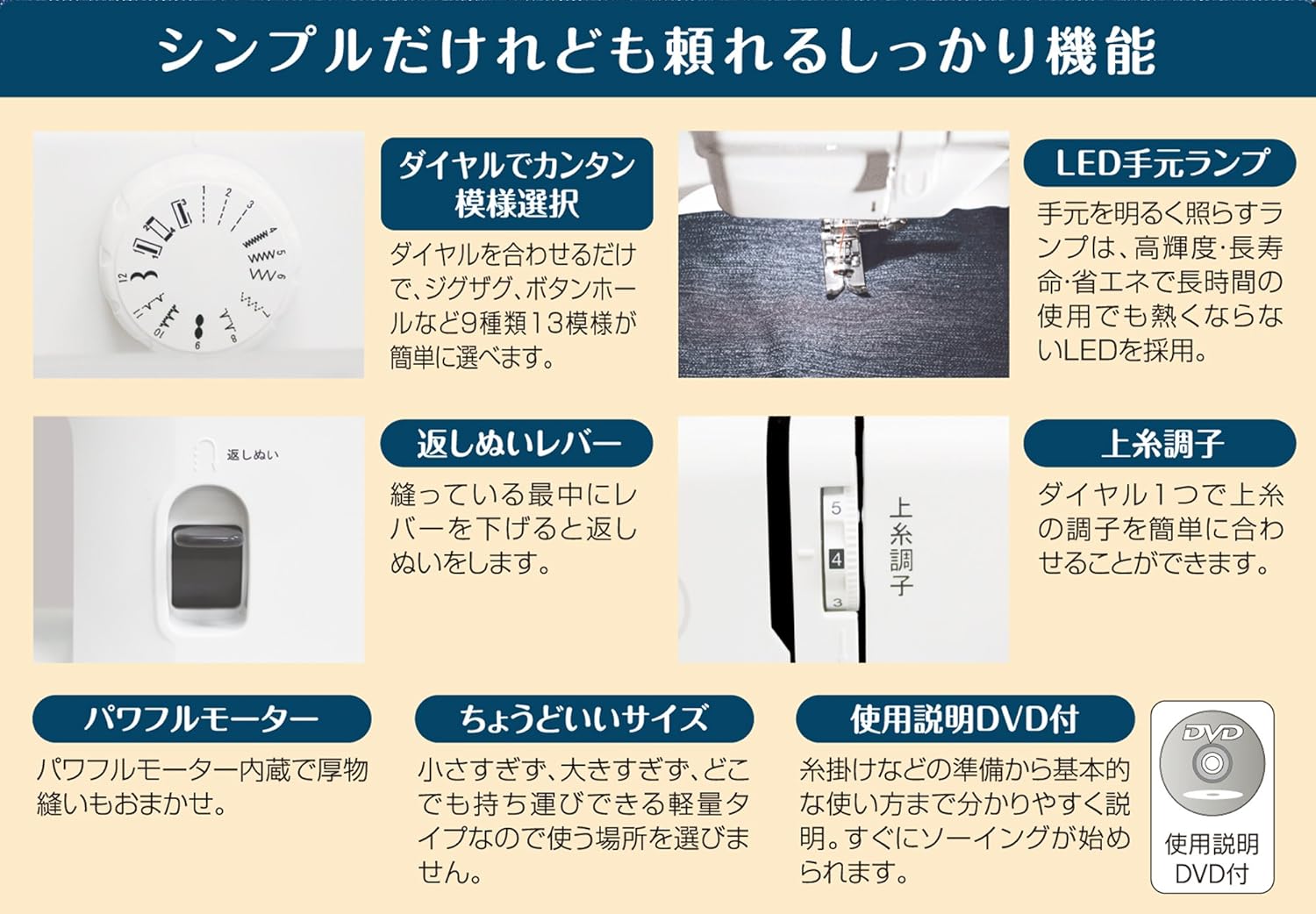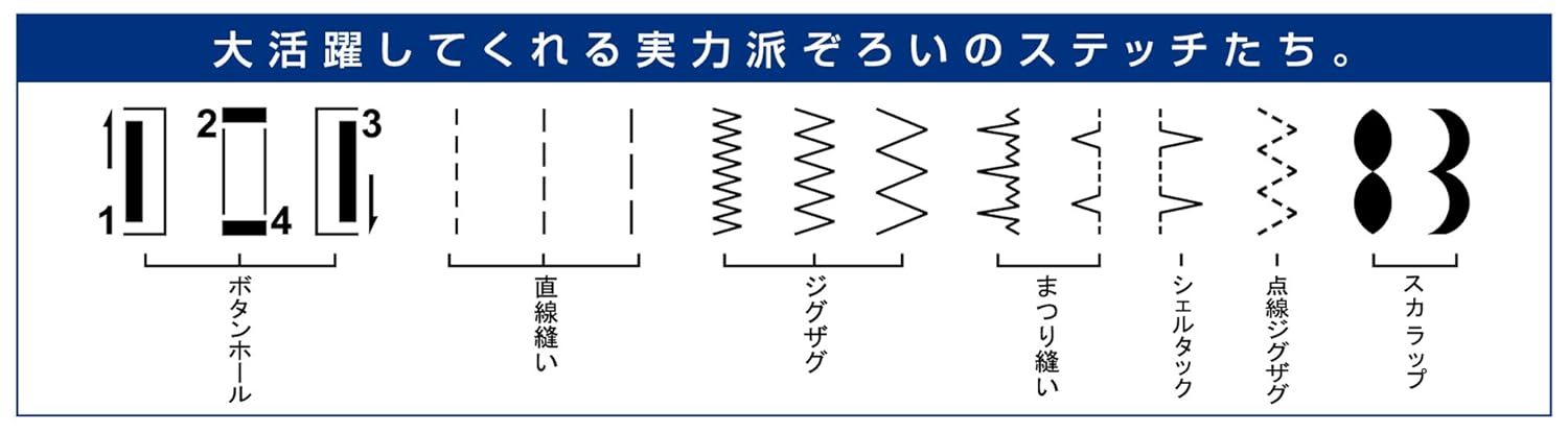 付属品:ジグザグ押え、ファスナー押え、ボタンホール押え、ドライバー、ブラシ付リッパー、糸こま座、針パック、ボビン、糸こま押え(大・小)、ソフトカバー、電源コード・フットコントローラー(一体型)、取扱説明書、保証書