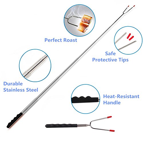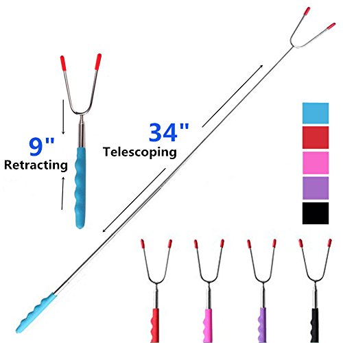 - ★ LONG ENOUGH & SAFE. Extended to 34inches telescoping forks keep you and kids at a safe distance from campfire or sparks. The prongs’ sharp tips are protected with rubber, making them perfect for use around children. 5 multi colored BPA-Free handles make identification easy. Each kid could have his own marshmallow roasting fork.