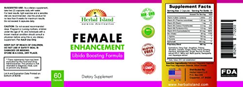 -. Feature : All Natural Female Enhancement, 60 Count Capsules 30 Day Supply / Libido Boosting Formula. Gluten Free, GMP Certified Facility in USA / Natural Veggie Capsules, Non-GMO, Natural Ingredients / Formula Blend Ingredients: Epimedium (Horny Goat Weed), Dong Quai (Angelica), Tribulus Terrestris, Catuaba, Gingko Biliba, Panax Ginseng, Damiana, Ashwagandha, Ginger, Mucuna Pruriens extract, Maca Root, Muira Puama, Sarsaparilla Root, Asparagus Extract / This Formula is proudly encapsulated and bottled in Utah in an FDA-approved facility which follows strict GMP guidelines. Our products are Third Party Tested to ensure the highest quality possible and the purity of each batch.
