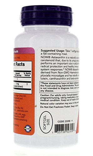 Potent Free Radical NeutralizerA Dietary SupplementAstaxanthin is a naturally occurring carotenoid that, due to its unique structure, performs an important role in cellular free radical protection. NOW Astaxanthin is derived from Non-GMO Haematococcus pluvialis microalgae.Feature