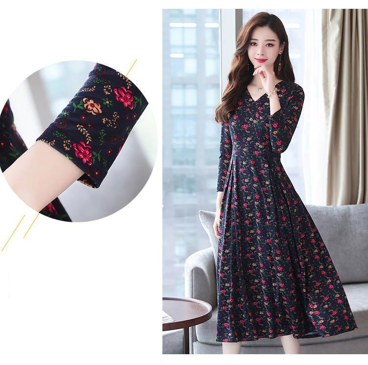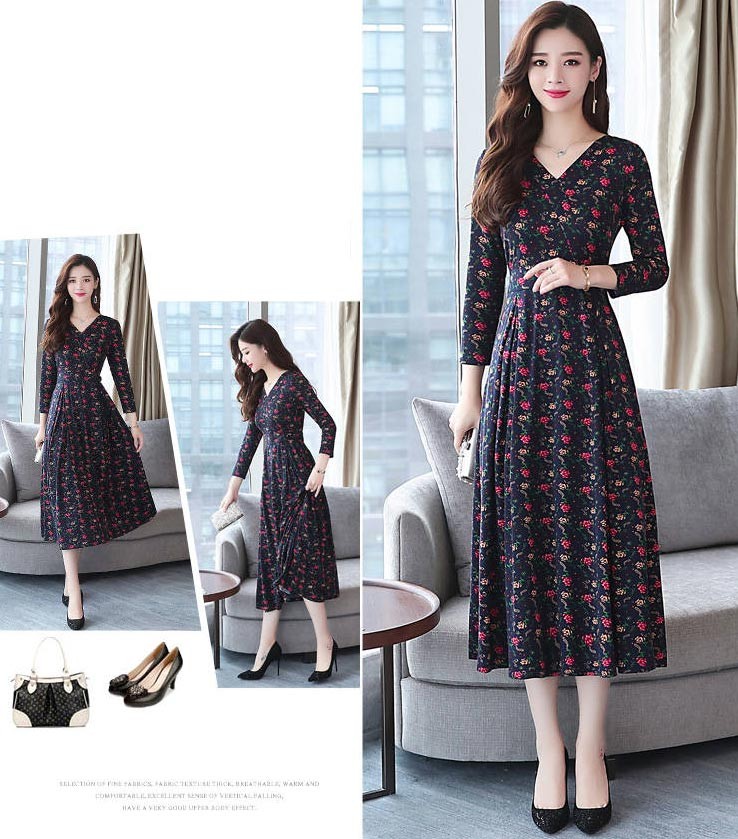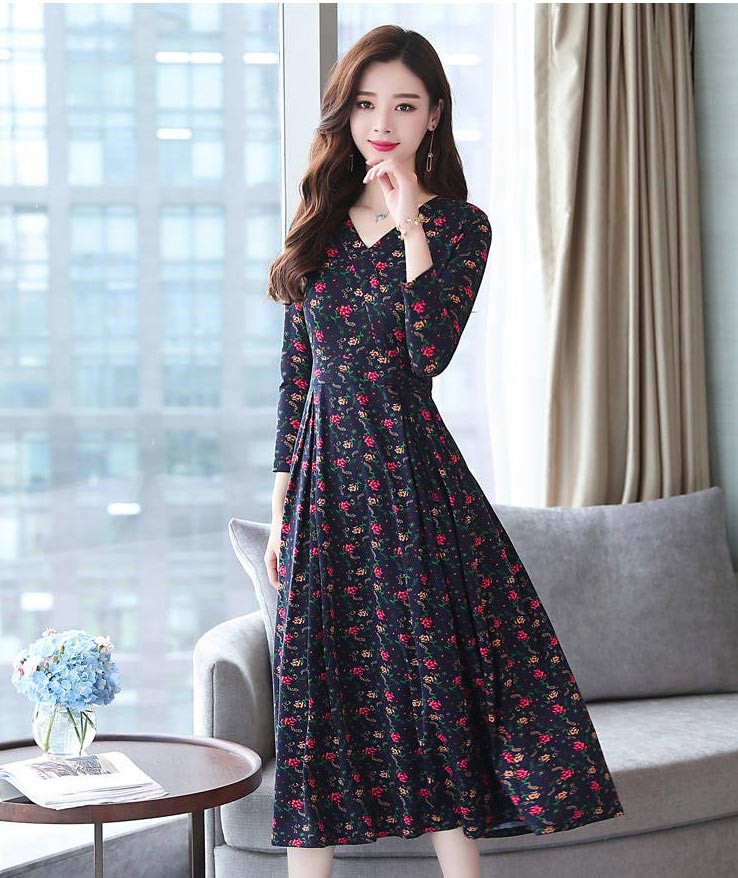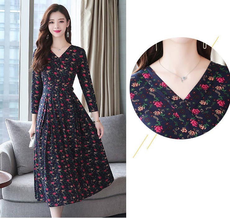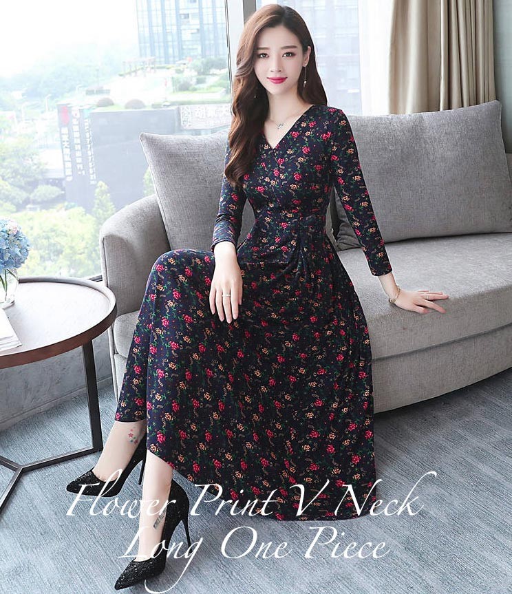 Vネック・ハイウエスト切替フレアのフラワープリントワンピース♪
