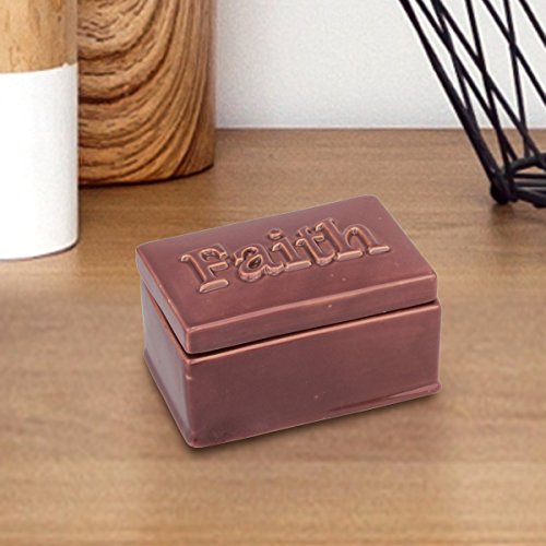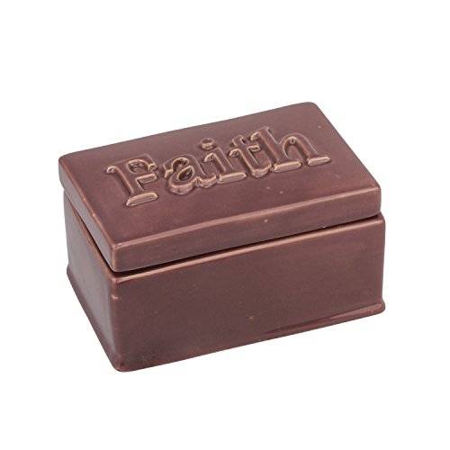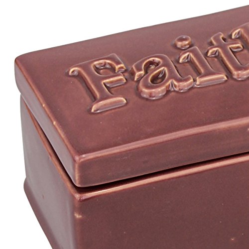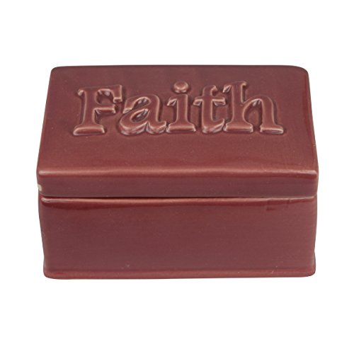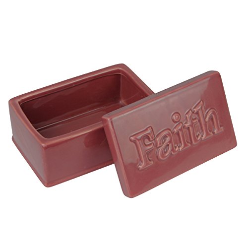 - This decorative ceramic storage container features a smooth maroon finish that is lightly distressed and the word "Faith" raised on the removable lid