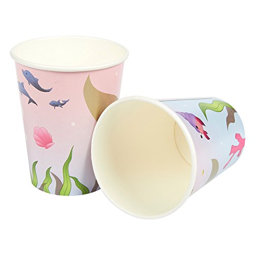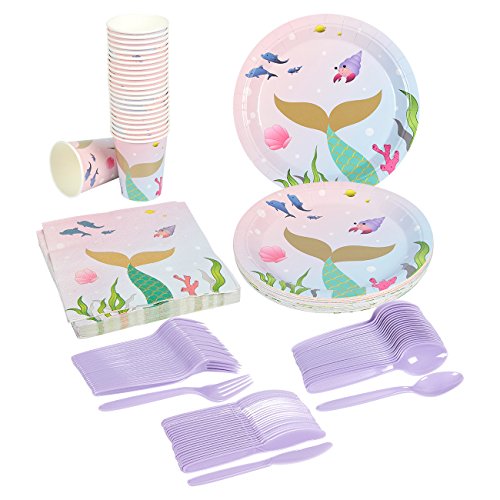 -. Feature : SERVES 24: This mermaid P.R.Incess themed set includes enough tableware for 24 guests; contains 24 of each of the following: Plastic Knives, Spoons, Forks and Paper Plates, Napkins and Cups. The plastic silverware is in light purple while the paper plates, napkins and cups are in various colors. The tail of the P.R.Incess mermaid and her companions in the sea are depicted on the plates, cups and napkins. / HIGH QUALITY: Plates are thick and rigid and won't fold while carrying food. Napkins are soft and absorbent--a pleasure to use. / SAFE & ENVIRONMENTALLY FRIENDLY: Flatware set is 100% Food Grade and BPA-Free. Plates, Cups and Napkins are made of environmentally friendly biodegradable paper. / GREAT FOR ALL OCCASIONS: Suitable for all occasions including parties, catering, outdoor events and simply just eating at home. / DIMENSIONS: Flatware is approximately 6 inches long. Paper cups hold approximately 9 oz of liquid. Napkins are 3-layer and measure 13 x 13 inches when unfolded and 6.5 x 6.5 inches folded. Plates are approximately 9 inches in diameter.