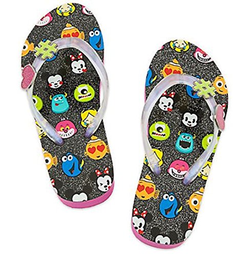 Disney Emoji Character Flip Flop Sandals for Girls. These cute colorful wedge sandals feature glittery strap with click on hashtag and heart and colorful character Glittering screen art footbed Emoji style characters include Minnie, Nemo, Dory, Sulley, Mike Wazowski, Alice, and Cheshire Cat Jelly straps with two glittering cloisonné charms Non-slip solesFeature