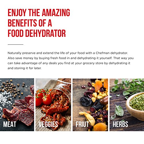 INNOVATIVE DESIGN: The Chefman 480W Food Dehydrator has a built in innovated design that maximizes airflow that results in an even drying without overheating ensuring the perfect dried fruit slices, long-lasting dried herbs, delicious beef jerky and more.