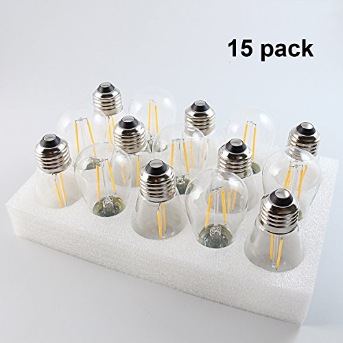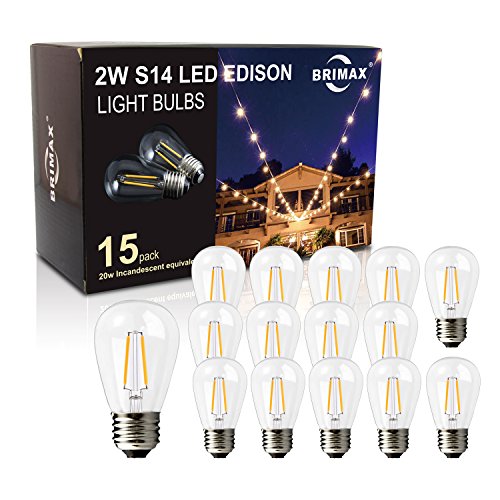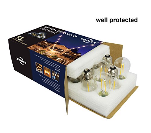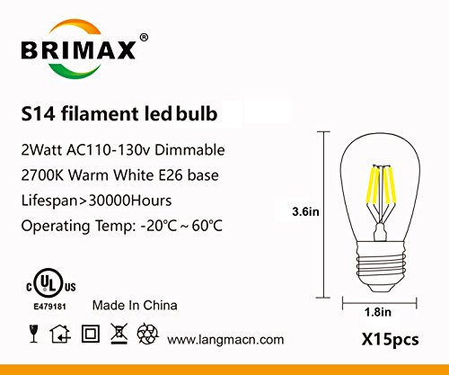Studio : BRIMAX Publisher : BRIMAX Product Description Full Specification 1) Wattage: 2watt, 20watt incandescent bulb equivalent 2) Input Voltage: ac110v-130v 3) Base: E26 Medium Screw Base 4) Lumens: 180lm, equal to 20watt incandescent bulb 5) Kelvin: 2700K, soft warm white 6) Dimmable: yes 7) CRI: Ra80 8) Cover: durable clear glass 9) Dimension: D1.8inches * H3.6inches 10) Energing rating: A 11) Lifespan: 30,000 hours 12) UL Listed: UL certificate No. E479181 Bulb Package Package Including: 15pcs 2w e26 S14 filament led bulb, well protected Application: mainly used for outdoor waterproof commercial led string lights 1) Commercial Patio LED String lights 2) Pendant LED Bulb Light 3) Other Lighting Fixture with E26 Medium Screw Socket