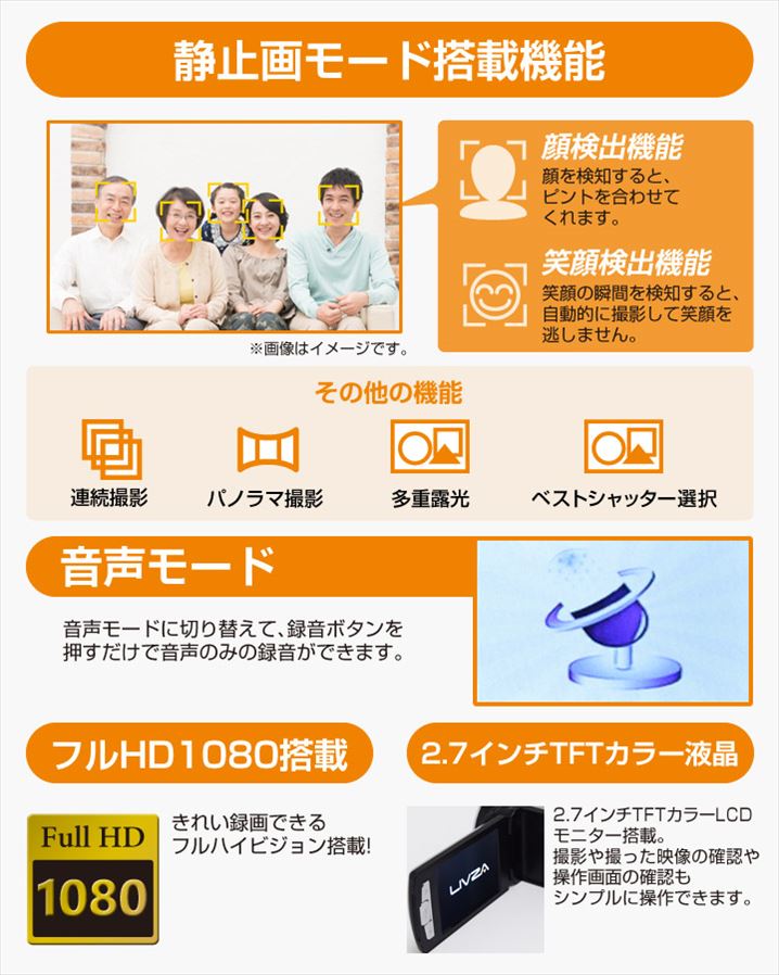 ●・顔検出機能 ・笑顔検出機能 ・連続撮影 ・パノラマ撮影 ・多重露出 ・ベストシャッター選択