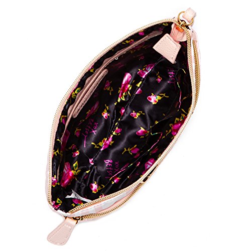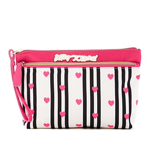 -. Brand : Betsey Johnson -. EAN : 0889487207313 -. Feature : Trapezoid wristlet in P.R.Inted nylon with faux leather trim. / Front logo emblem. Front zip pocket. / Top zip closure. Wristlet zipper pull. / Lined. Interior zip & slip pockets. / 8.5" W x 6.5" H x 2" D -. ProductGroup : Shoes -. ProductTypeName : HANDBAG -. Size : One Size -. Title : Betsey Johnson Striped Heart Trapezoid Wristlet, Fuchsia/Black -. UPC : 889487207313