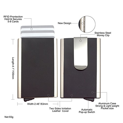 -. Feature : RFID BLOCKING WIRELESS THEFT - RFID blocking protection design, keep your P.R.Ivate information and credit card away from thieves' scanning devices, insure your P.R.Ivate property safety. MOSIYEEF slim wallet farthest protects your P.R.Ivacy. / HIGH TEXTURE AND APPEARANCE - Made of premium aviation aluminum materials from top manufacturer and covered with premium PU leather on both sides.High strength metal body protect your cards from physical damage and ensures long service life, while high grade PU leather enchance the texture and appearance / SIMPLE & EASY TO USE - Push the button on the bottom, the card will pop out automatically.You can easily get the cards in the card holder, simple and elegant.CAPACITY for up to 8 CARDS.With Strong stainless steel Money clip that can easily carry 5~8 folded bills / PERFECT CHOICE - Practical, makes Big Impression when taken out in front of friends and family. Luxurious look and excellent quality makes this wallet great as a gift or even better for self-use. We honestly believe you will love this wallet / 100% SATISFACTION RISK-FREE MONEY BACK GUARANTEE - MOSIYEEF offer 60 Days Money Back & Lifetime Guarantee and Friendly, Easy-to-reach Support. Please Choose MOSIYEEF.