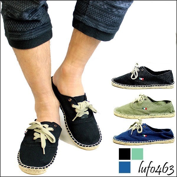 | イタリアンカラーがワンポイント | 品の良いカーキ系色の紐 | イン・サイドソールには編み込んだ ジュート素材 |