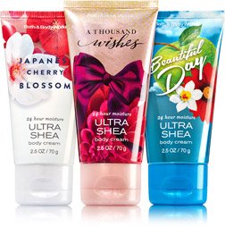 -. Feature : Keep skin soft & smooth when you're on-the-go with 3 of our NEW Fun Size Body Creams! Made with soothing Aloe Butter, pampering Cocoa Butter and more Shea than ever before, our non-greasy formula melts into skin to provide beautiful fragrance and 24 hours of nourishing moisture. Trio comes with one each of three fan favorite scents! / Japanese Cherry Blossom is an oh-so-fresh blend of Japanese cherry blossoms, crisp pears, mimosa petals & sweet sandalwood / A Thousand Wishes is a festive blend of sparkling champagne, crystal peonies & almond crème / Beautiful Day is a day-dreamy blend of daisies, pink peonies & sun-kissed apples / Size:2.5 oz / 70 g Each