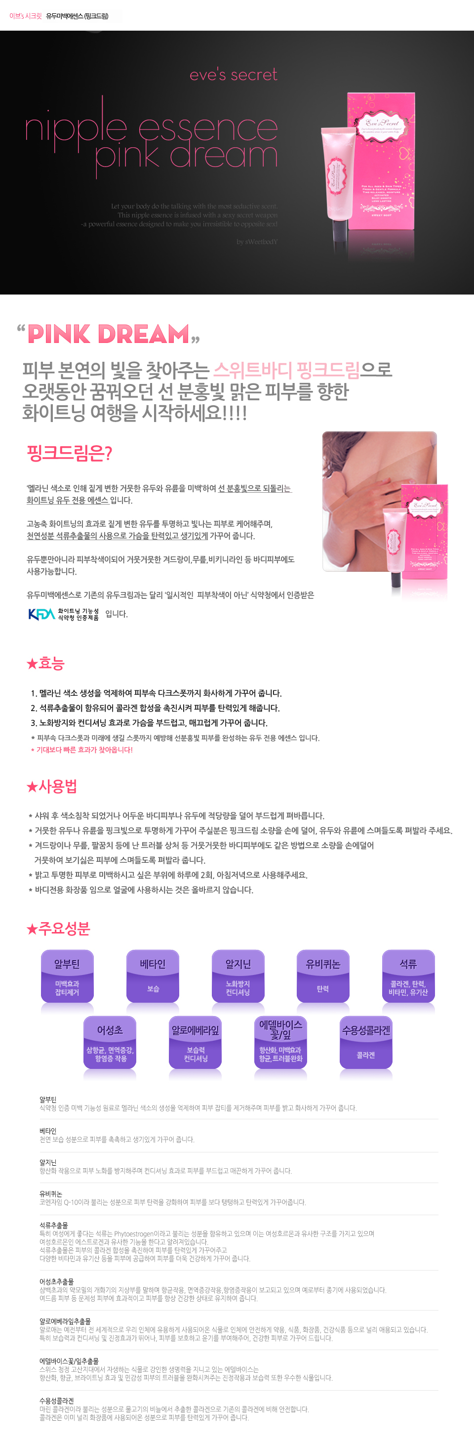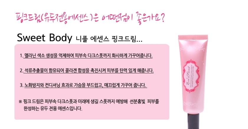 With this sweet body pink dream to regain the light with innate skin, begin your whitening trip toward pink and clear skin that you have dreamt for so long!!!