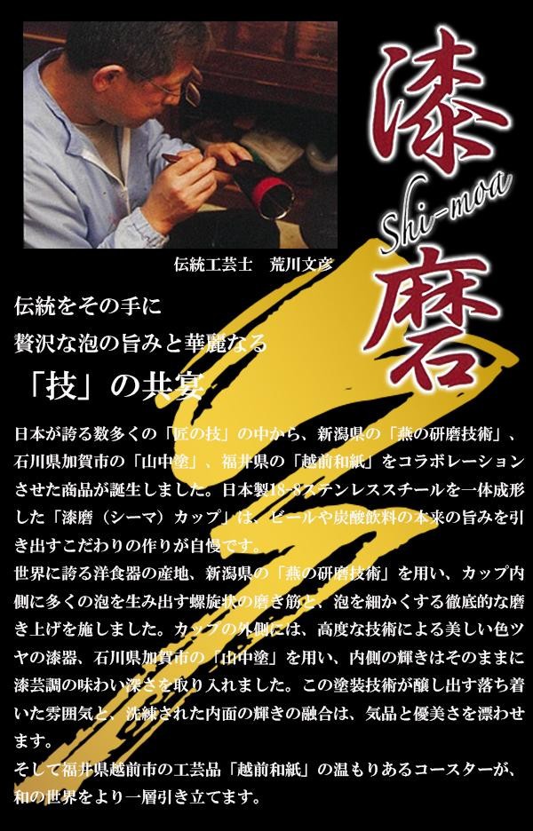 新潟県の「燕の研磨技術」、石川県加賀市の「山中塗」、福井県の「越前和紙」のコラボレーション。ビールや炭酸飲料の本来の旨みを引き出す、こだわりの作りが自慢です。 |