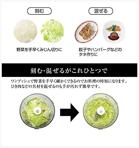 원 푸쉬로 요리 폭이 넓어진다!요리 사전준비나 재료가 한데 섞게!! ●날씬하고 콤팩트이기 때문에 키친의 장소를 차지하지 않다! ●잘게 써는 혼합하지만 이것 하나에!요리 시간 단축에! ●잘게 썬다!야채를 신속하게 채 썲으로. ●혼합한다!만두나 햄버거 등의 씨 만들기에.용량:약500ml 회전수:약4250rpm(무부하 시) 정격시간:1 분중량:약660g