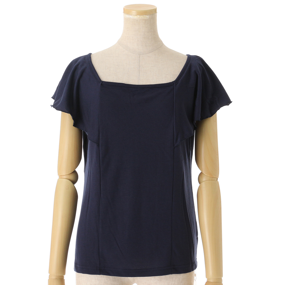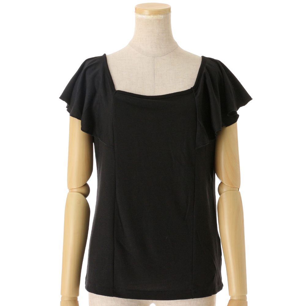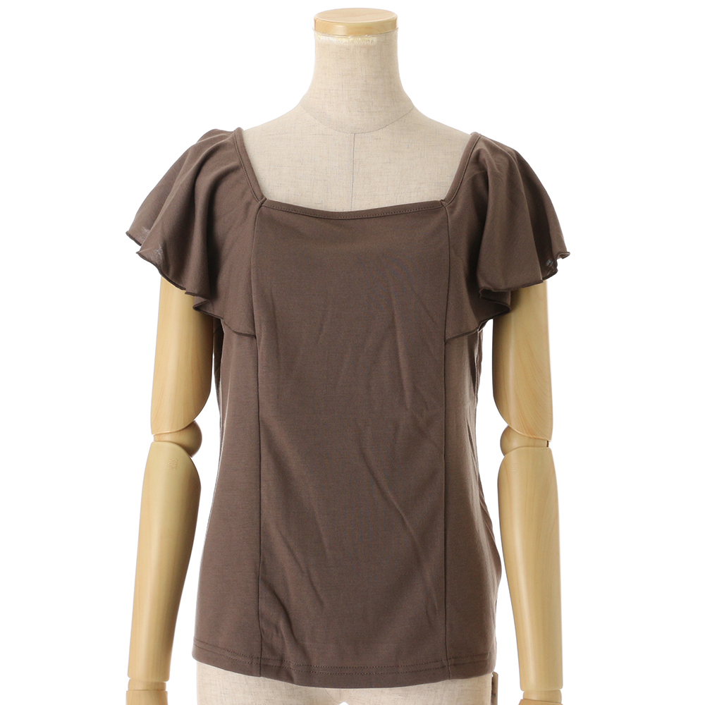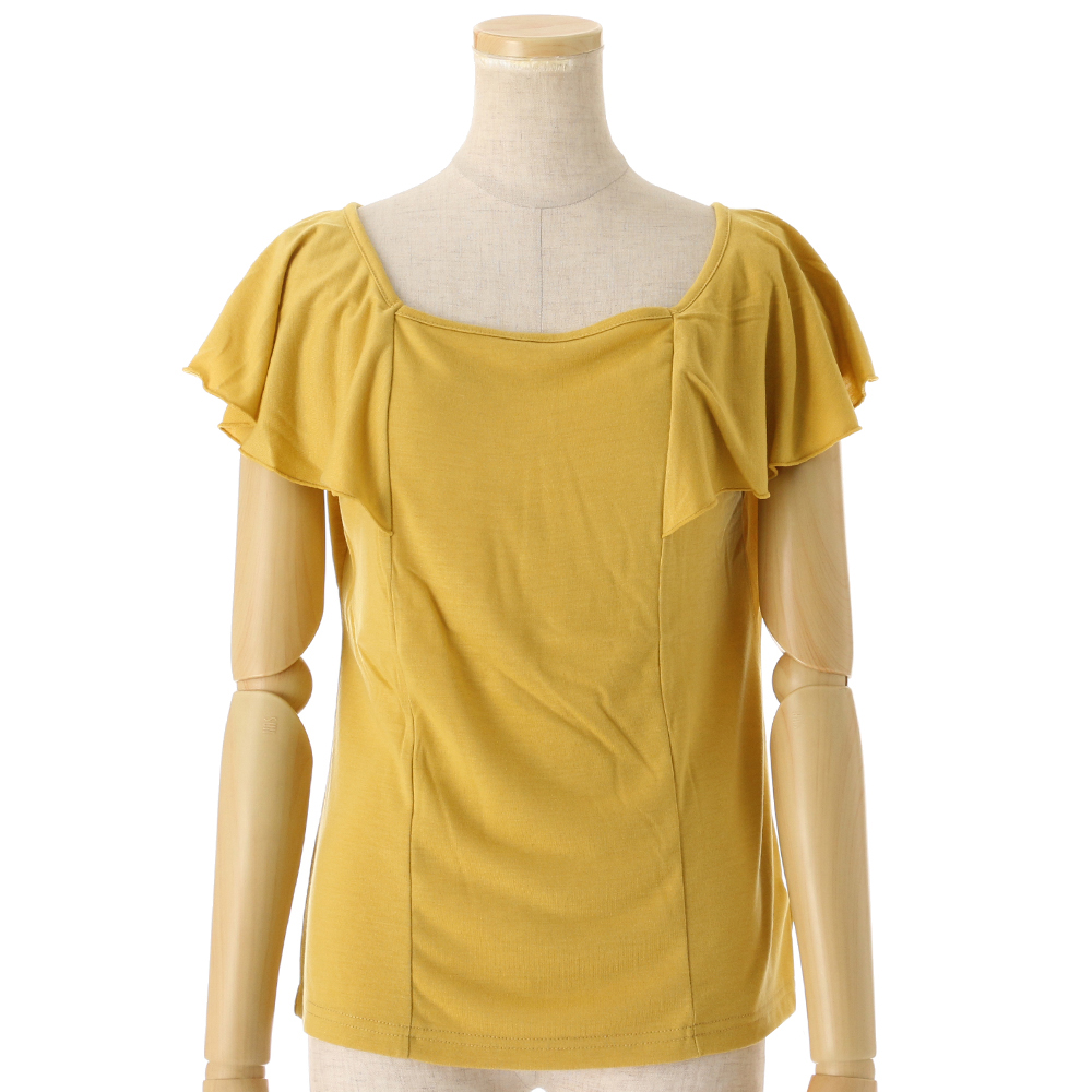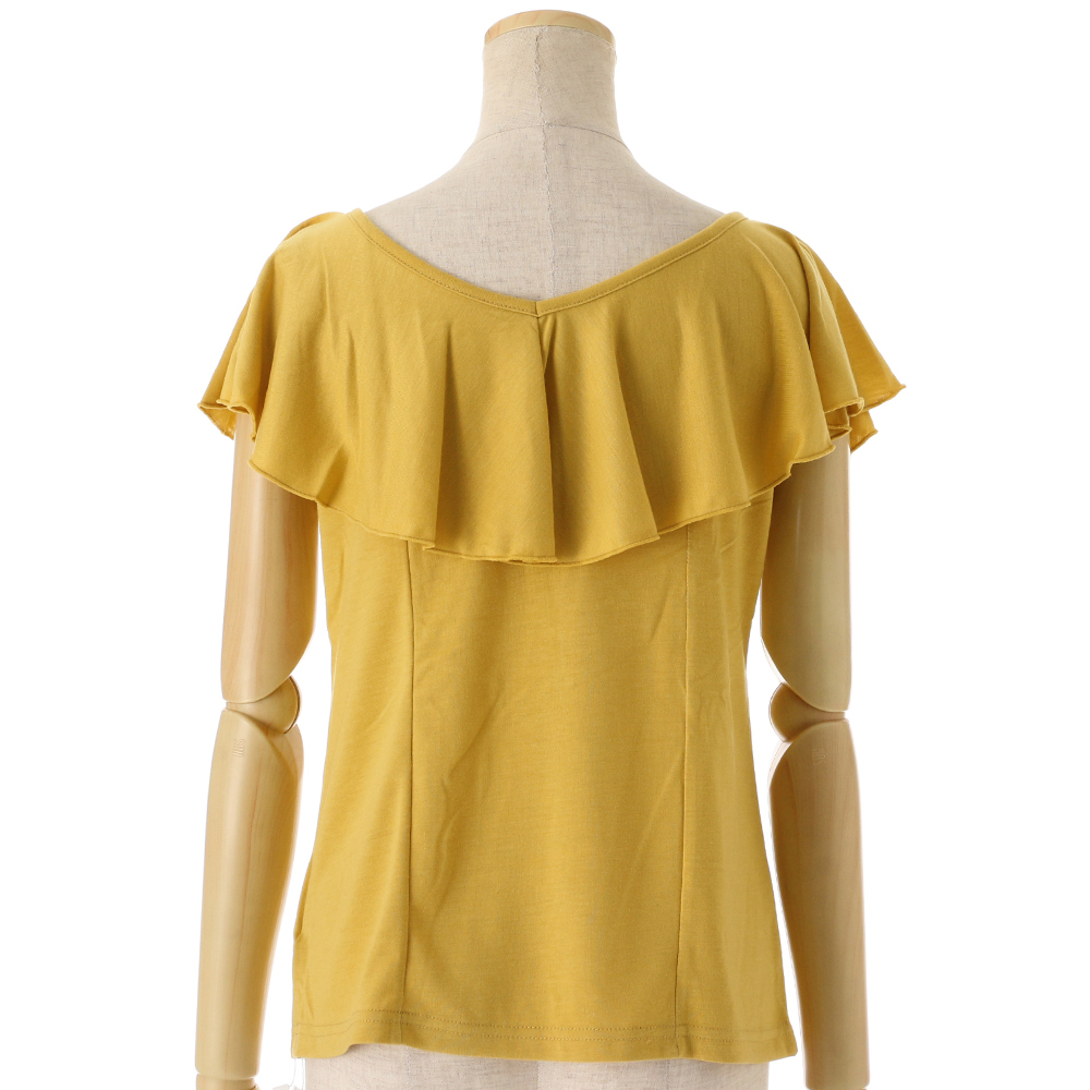 前後着用可能な2WAY「オフショルダー」アイテム!!フリルデザインのカットソーは、女性らしい印象をグッと引き立てます。デコルテも綺麗に見え、顔回りがスッキリとした印象に。盛夏も涼しく着用いただけます。