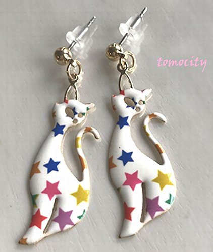 -. Feature : お座りしたスリムな白猫モチーフ、薄くて軽いピアスです / ぷっくり膨らんだフォルムと、カラフルな星柄の雰囲気が素敵 / シンプルなお洋服のアクセントにおすすめです / 猫のサイズ: およそ 35 mm / ピアス全長: およそ 45 mm