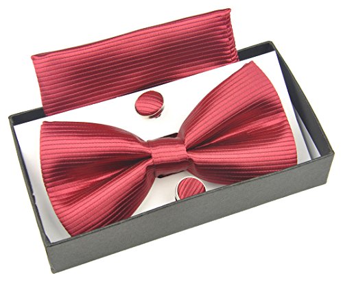 -. Feature : Material: Polyester Silk / Bow Tie size: 12(L)*6.5(W)cm; Pocket square size: 20.5*20.5cm / Package contains: 1*bow tie, 1*pocket square, 1 pair *cufflinks. Packaged with gift box / Occasion: Perfect for any formal occasion like, wedding, musical band, evening party and any other occasion / Pre-tie bow ties with adjustable band collar