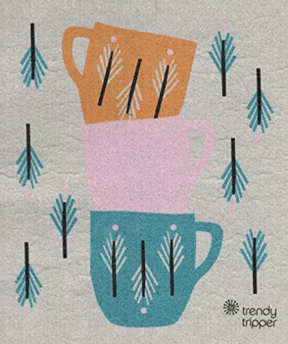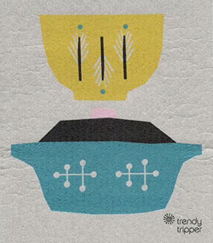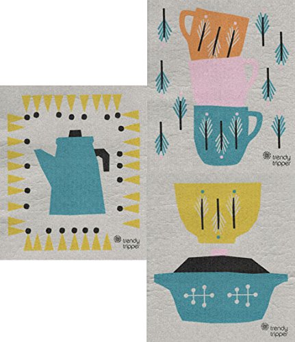 Swedish Dishcloth - Anna Kovecses Midcentury Designs - Set of 3 Kettle/Cups/Bowls (Cobalt Blue/Yellow/Orange on Grey)