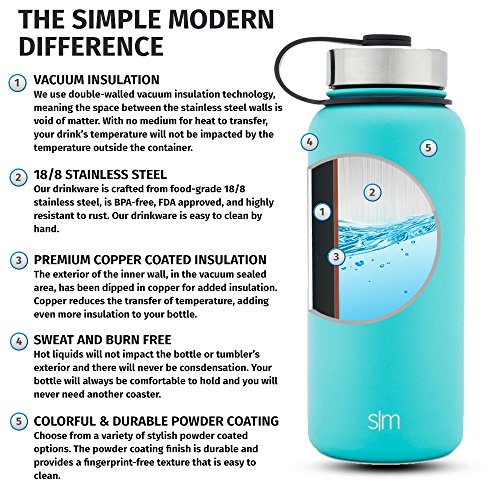 VACUUM INSULATED - The Simple Modern Summit water bottle is double-walled and vacuum insulated. This technology will keep you drink cold for up to 28 hours or hot up to 8 hours. This wide mouth reusable bottle will never sweat.