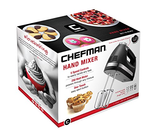 THE CHEFMAN RJ17-V2 SERIES TURBO HAND MIXER With an impressive 250W motor powering five speeds plus a turbo button, this ultimate kitchen appliance provides you with the power and control to take on a wide range of mixing tasks with ease.