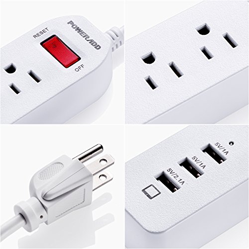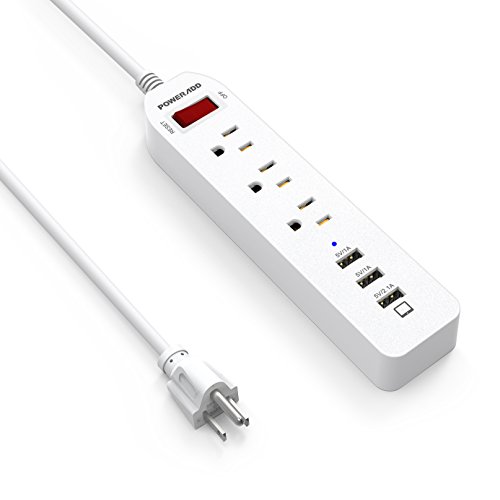 Poweradd 3-Outlet Power Strip 5-foot Heavy Duty Extension Cord with 3 USB Charging Ports, White