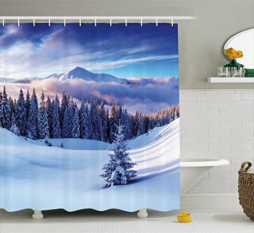Winter Decorations Shower Curtain by Ambesonne, Surreal Winter Scenery with High Mountain Peaks and Snowy Pine Trees, Fabric Bathroom Decor Set with Hooks, 70 Inches, Blue White