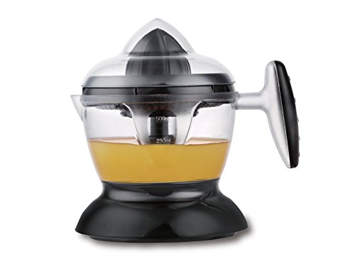 Citrus Juicer - 120V, 60Hz, 25W. Has a 500ml capacity. Removable juice reservoir with spout and handle, Transparent lid and a convenient cord storage base