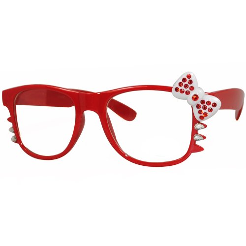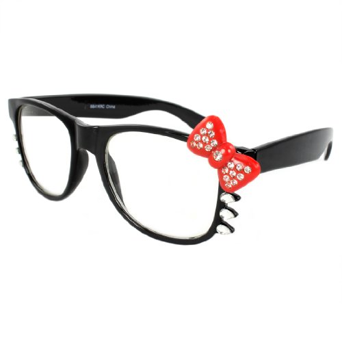 Cute Hello Kitty Nerd Clear Lens Eye Glasses Black Frame Red Bow Silver Rhinestone (Red)