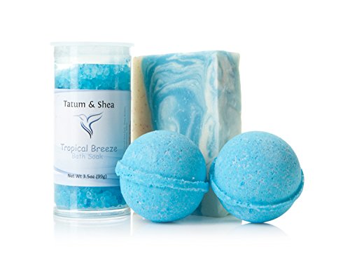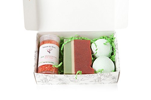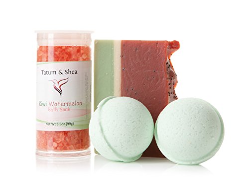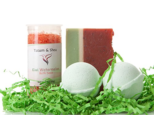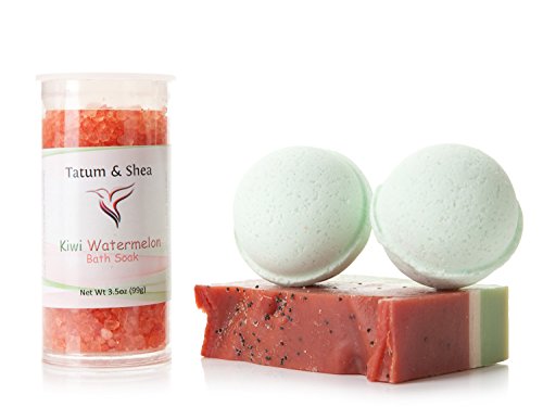 Your own private spa, at a price you can afford. Your Tatum & Shea Bath Set features handmade soap, kiwi watermelon Dead Sea bath salts, and 2 luxury melon scented bath bombs to soothe away the aches and pains.