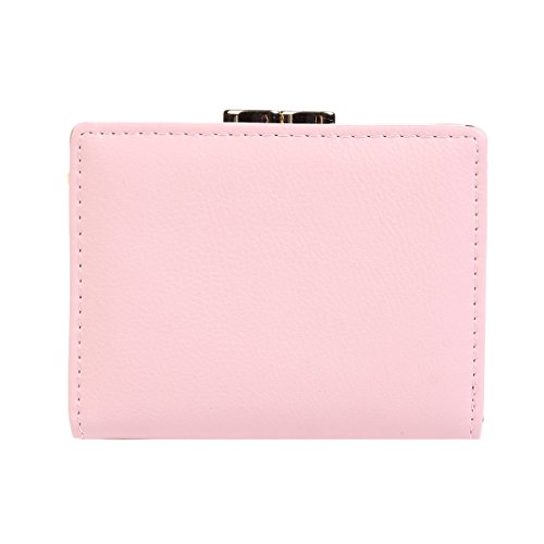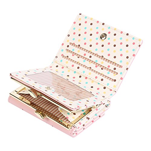 -. Feature : Material:Faux leather / The front snap closure with 1 photo window,7 card slots,1 bill site compartment / A kiss-lock closure in the middle includes a coin pocket / The behind snap closure?inner with?4 card slots and 1?photo window / Measurement is app 10.5x8x3cm(7.48x3.14x1.18inch).