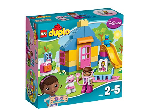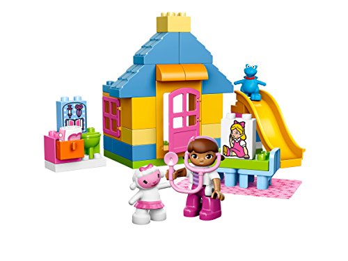 The Doc is in! Help Doc McStuffins and friends Lambie and Stuffy look after all her toys in the Backyard Clinic! Susie Sunshine is sick and needs Doc to make her feel better. Time for check-up with the medical tools to find out what the problem is. Lambie is on hand to pass a blanket or a bandage if they are needed. The special 2-sided decorated brick can be turned around to show Susie sick and then when she is cured. When Doc's work is done for the day, it's time to play on the slide with all her friends! This Duplo brand Doc McStuffins set provides endless role-play opportunities for young children to treat injured toys, while encouraging early construction skills through building and rebuilding the clinic. The LEGO brand Doc McStuffins Backyard Clinic comes with Doc figure plus Lambie and Stuffy and a medical-tools-decorated brick.