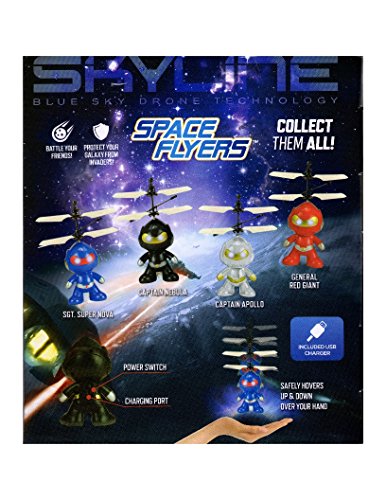 Studio : Blue Sky Wireless, LLC Publisher : Blue Sky Wireless, LLC Binding : Toy Product Description Space Flyers are fun to fly and battle with friends or work together to protect your galaxy from invaders! You can also collect "Captain Apollo" (White), "General Red Giant" (Red) and "SGT. Super Nova" (Blue). About 5-10 minutes charge time and 10 minutes of flying time. Watch as your Space Flyer hovers down, place your hand underneath for it to go back up. 0