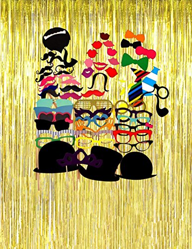Famoby 2pcs Gold Metallic Tinsel Foil Fringe Curtains And 58pcs Photo props Glasses hat beard