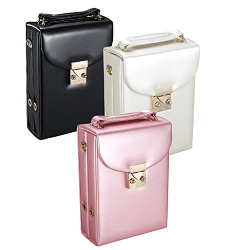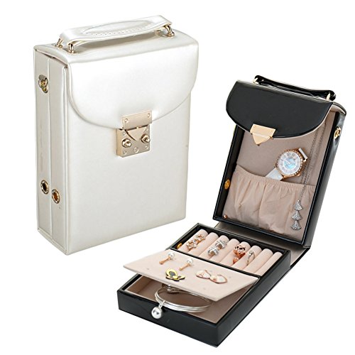 -. Feature : Material: in a PU leather effect with a soft padded top, Compact but very useful and well thought out design. / It's 7.3 x 5.1 x 2.2 inches (18.5x13x5.5 cm) so easy to slip into your suitcase or bag. / It fits 6 stud earring pairs, several pillows in the middle for rings and on the other side for necklaces or watches. And there is a secret compartment under the earring holder. / The case with clasp closure, comes with a removable strap, you can use it as a shoulder bag for wallets and phone. / It is a great idea to keep everything organized and the perfect size for travel shopping, and a great Christmas gift for girls.