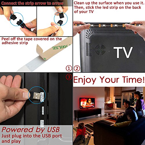 - 【USB PORT】 The USB Strip light is connected through 5V USB ports. You can plug into different device, such as your computer, desktop, laptop, TV, tablet, car cigarette lighter, cell phone charger, 5V adapter and so on. The multi-color lights will make your life more colorful.