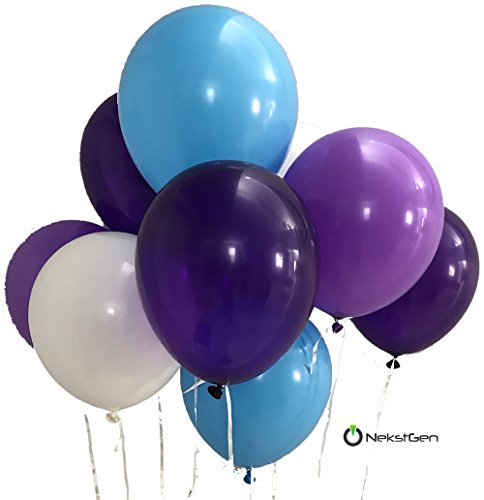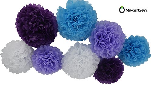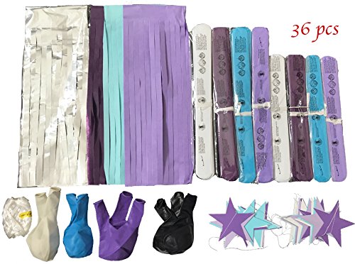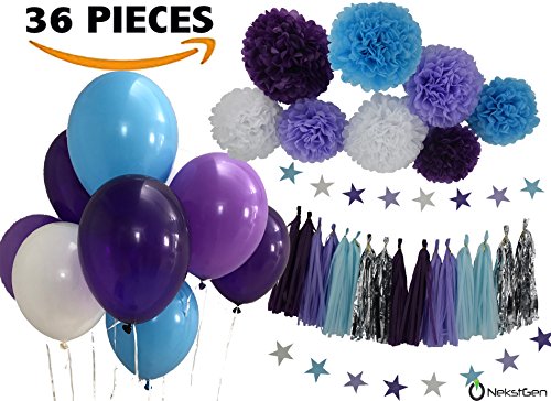 - BEAUTIFUL COMPLETE 36pc. SET: You get 8pc Pom Poms - 4x10” and 4x12” Pom Poms, 2pcs. Purple, 2pcs. Lavender, 2pcs Baby Blue and 2pcs White Pom Poms. 16pcs. 14” Paper Tassels – 4 Purple, 4 Baby Blue, 4 Lavender, 4 Silver Foil Paper Tassels. 2pc. 3” mix colored Star Garlands, each 6.5 feet long. 10pc. 12" Latex Balloons - Mix bag of White, Lavender, Purple and Baby Blue color with strings. A complete Party Favor Decoration Kit with YouTube video instructions.