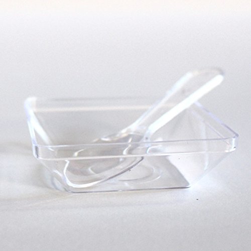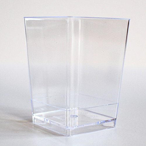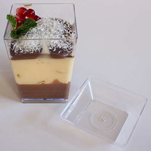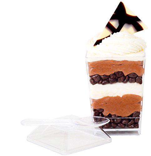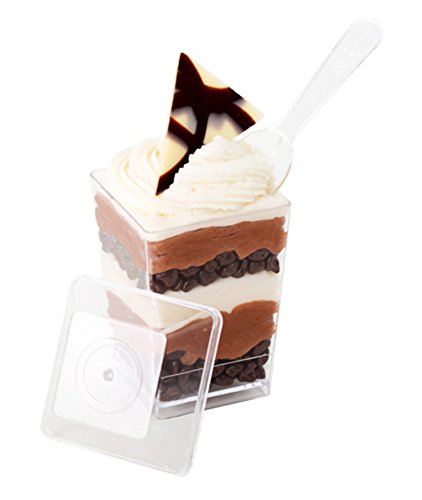 - Feature : SupaCute Desserts clear plastic square parfait glasses 3.38-ounce set of 25 dessert cups with 25 snap lid containers and 25 mini dessert spoons. The square dessert cups has a capacity of 3.38 oz with height 2.75 inch. Disposable, washable, reusable, freezable and used as jello shot, shooter glasses and pudding cups. / BPA free parfait glasses with hard crystal clear food grade plastic tumbler buffet cups for chocolate mousse, yogurt parfait, pudding and any desserts. / Comes in set of 25 count mini dessert cups, 25 count mini dessert spoons and 25 count lids (lid can be used also as appetizer plate for hors d'oeuvre). / The most popular size and shape food containers dessert glasses in catering supplies, party and household supplies. Ideal for baby showers, new year's eve, retirement, carnival and much more. / 30-DAY MONEY BACK GUARANTEE & PROMO: See promotion below for your discount when purchasing 2 or more SupaCute Desserts (TM) square parfait glasses 3.38-ounce set of 25 dessert cups with 25 snap lid containers and 25 mini spoons. Promotion applied automatically at the time of purchase. Get yours now!