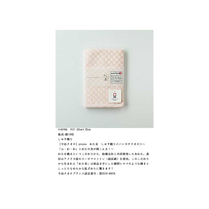 원본상품명: 今治タオル ハンカチ わた音 しゅす織り ピンク 1-60070-11-PAP