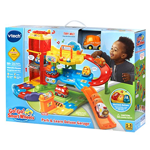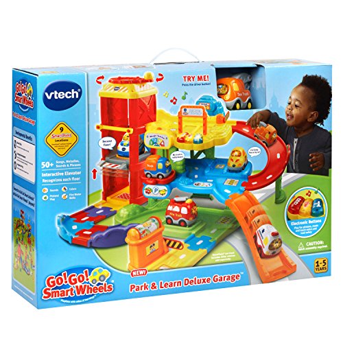 -. Binding : Toy -. Brand : VTech -. EAN : 7658069462852 -. Feature : Enhance your child's creativity with Go! Go! Smart Wheels toddler toys; kids build their own interactive toy car garage and race vehicles around for maximum fun / Roll SmartPoint tow truck over 9 SmartPoint locations to hear different phrases, music or fun sound effects; includes 7 interchangeable track pieces / Press the toy tow truck's light-up button to hear 3 sing-along songs and learn the letter T and vehicle name; ages 1 to 5 years / Interactive role play features like pressing the light-up buttons, turning the helicopter pad to raise and lower the elevator and other fun manipulative elements build motor skills / Enhance and expand play with connectible Go! Go! Smart Wheels and Go! Go! Smart Animals playsets and collectible figures; all vehicles and playsets work together / Garage requires 2 AA batteries (not included); tow truck requires 2 AAA batteries (batteries included for demo purposes only; new batteries recommended for regular use) -. IsAdultProduct : 0 -. Label : VTech -. Manufacturer : VTech -. Model : 80-180000 -. MPN : 80-180000 -. PackageQuantity : 1 -. PartNumber : 80-180000 -. ProductGroup : Toy -. ProductTypeName : TOYS_AND_GAMES -. Publisher : VTech -. Studio : VTech -. Title : VTech Go! Go! Smart Wheels Park and Learn Deluxe Garage -. UPC : 737923375778 -. Warranty : 90 day warranty against manufacturer defects
