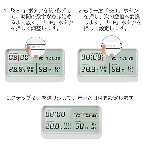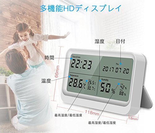 -. Feature : 「独特の外観設計」シンプルなデザイン、簡潔にさっぱりしていて。背中のステントが閉鎖になった時、体は完全に一体になって、非常に美しいです。そして、大型LEDディスプレイは16:9の黄金比デザイン、最高の視覚体験を提供します。 / 「簡単便利」温湿度計は温度、湿度、カレンダーと時間は一体に表示されます。それは精確に測定室内温度は-20℃から65℃まで、湿度測定範囲は10% - 99%。温度の精度は1度以内に。湿度測定精度は5 %以内とする。この最高と最低のデータは24時間で自動リセットです。 / 「読みやすい」大型LEDディスプレイを提供して、読みやすい。いつでも、どこでも。あなたの室内環境の正確なデータを提供します。 / 「直立,傾斜とマグネット放置方式」室内温度湿度計は卓上スタンド、あるいはしっかり吸着金属の表面のように背中に内蔵強力なマグネットもある。自宅の様々な場所に設置出来ます。  / 100 %満足1年メーカー保証」電源:1x 3.0v CR2032電池(含む)。私たちが1年の保証を提供する。もしあなたはどんな問題でも、直接この商品と同梱されたカードのアフターサービスメールアドレスとご連絡ください、対応させていただきます。