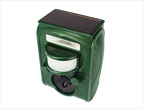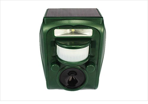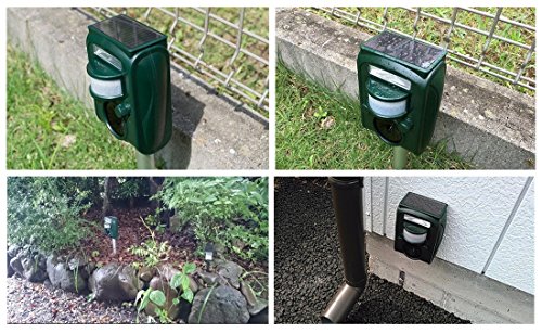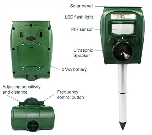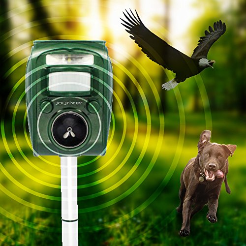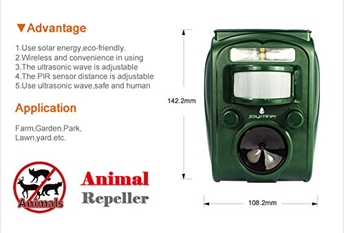 -. Feature : Joyriver Solar Powered Electronic Animal Repeller offers innovative pest repelling technology that repels birds and animals by targeting their main senses: Strong ultrasonic wave targets their feeling; The strobe light targets their sight. Alarm sound is added to scare wild animals. / Adjustable frequency settings allow you to target specific outdoors animals like mice, rats, dogs, foxes, martens, cats, raccoons, badgers, skunks, bats, birds, rodents, etc. A humane and non-toxic way of managing wildlife and pest populations by relocating them instead of killing them. / Features an adjustable PIR (Passive Infrared) motion sensor that senses motion from all directions up to 26 - 30 feet (8 - 9 meters). The unit responds to an intruder by flashing a blaze from its strobe and emitting high frequency ultrasonic sound, which is intolerable to most pests. / Only emits ultrasonic sound or flashes the strobe whenever its motion sensors are triggered. Automatic charging via built-in solar panel, energy-efficient and cost effective. / Easy installation and operation. Mounting Options: wall mount or outdoor in-ground mounting or flat surface placement.